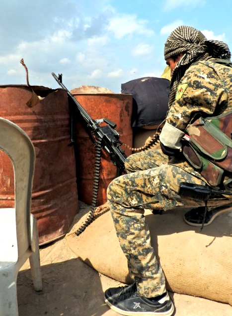 When I was enjoying tea with some soldiers behind trenches at the YPG base, the unit suddenly got busy. “We found moving objects across the river. We’re going to shoot.” I grabbed a camera and rushed to the scene where a lieutenant was instructing a soldier where to shoot. “Yallah,” right after the lieutenant ordered to fire, the gunshots of a light machinegun started to pierce the stillness of the atmosphere. We hear a lot of cracks of guns in action films today, but it is merely a film. The real ones are much more loud, heavy and fatal. The sound of death intermittently continued for a minute, and then the soldiers hid behind the trenches. After that, we heard some shoots back over the river. I did not hear the sound of hit on barricades, but suddenly realised this was the real war. This was the first and last time when I heard ISIS gunshot fired toward me in Rojava.